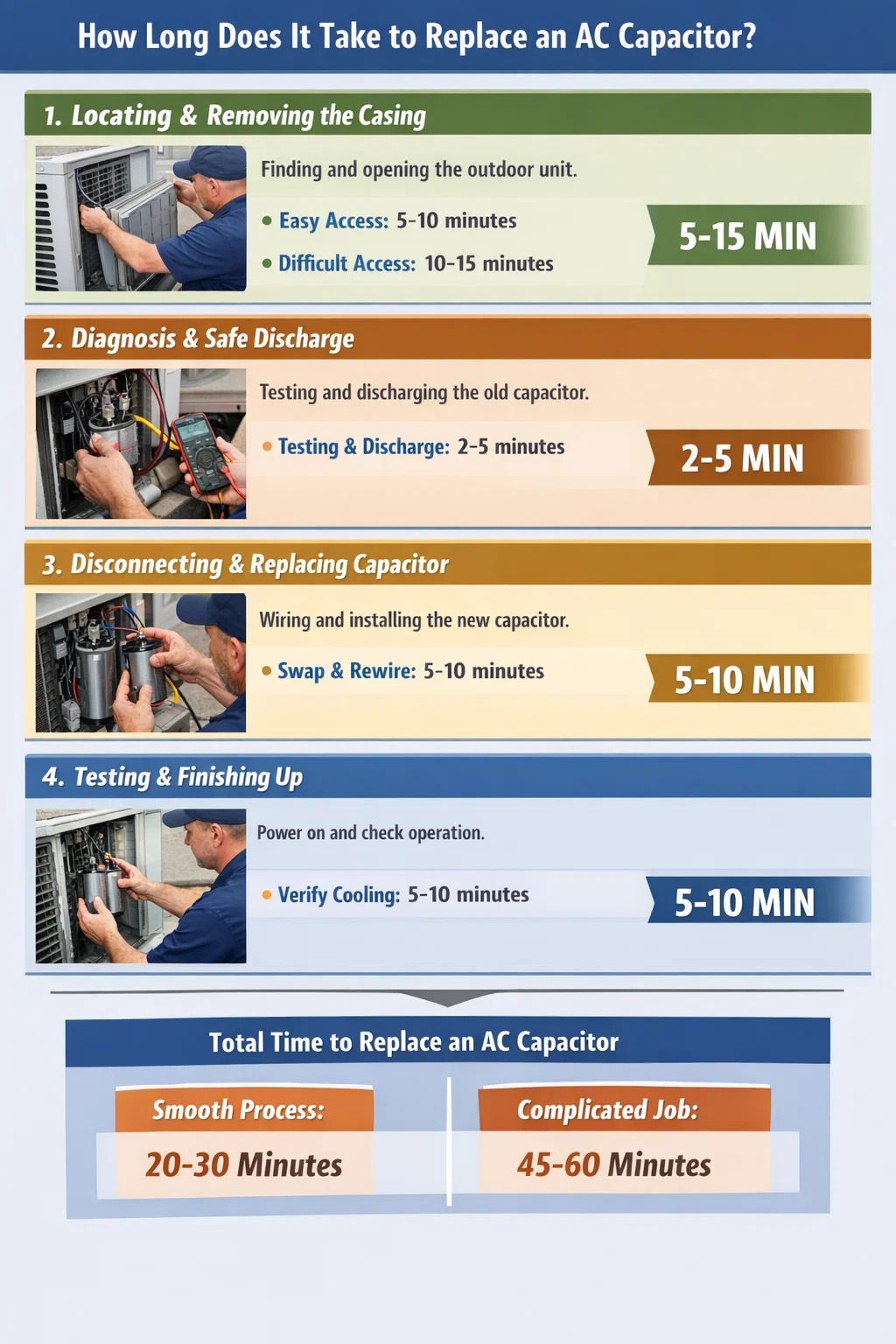 كم من الوقت يستغرق فعلا لاستبدال مكثف التيار المتردد ؟ إذا شاهدت الدقائق القليلة التي يعمل فيها الفني فقط، فقد تعتقد أن المهمة سريعة بشكل مدهش. ولكن من لحظة وصول الفني حتى يقوم المكيف بنفخ الهواء البارد مرة أخرى، هناك عملية كاملة متضمنة.