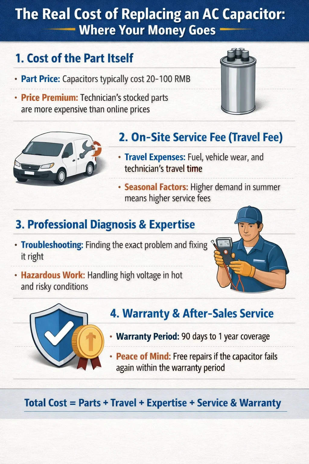 ما هي التكلفة الحقيقية لاستبدال مكثف التيار المتردد؟ يرى العديد من الأشخاص أن المعدن الصغير يمكن بيعه مقابل بضع عشرات من اليوانات فقط عبر الإنترنت، لكن فاتورة الإصلاح تصل إلى عدة مئات من اليوانات، مما يجعلهم يشعرون بعدم الارتياح.