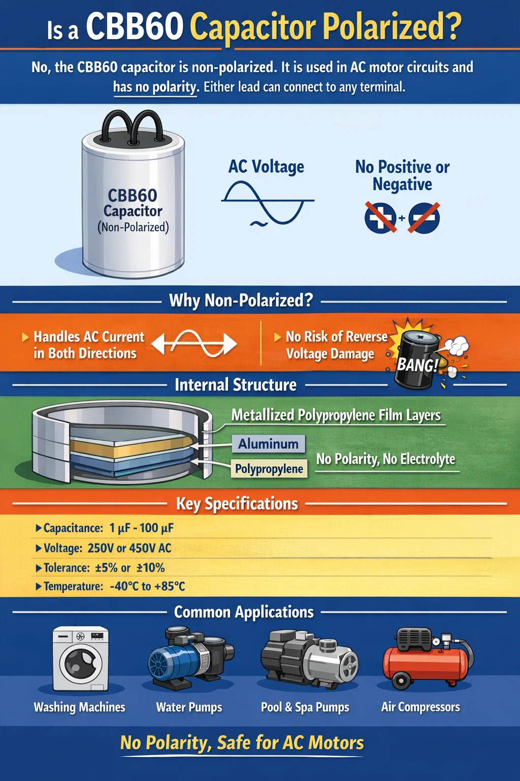 No, a CBB60 capacitor is not polarized. It is a non-polarized, AC-rated film capacitor designed specifically for use in alternating current circuits. Unlike electrolytic capacitors, which have a clearly marked positive and negative terminal and will fail — or even explode — if connected backwards, the CBB60 has no polarity whatsoever. You can connect either terminal to either side of your circuit without any concern. This is not a minor technical footnote; it is one of the defining reasons the CBB60 exists and why it is so widely used in AC motor applications.