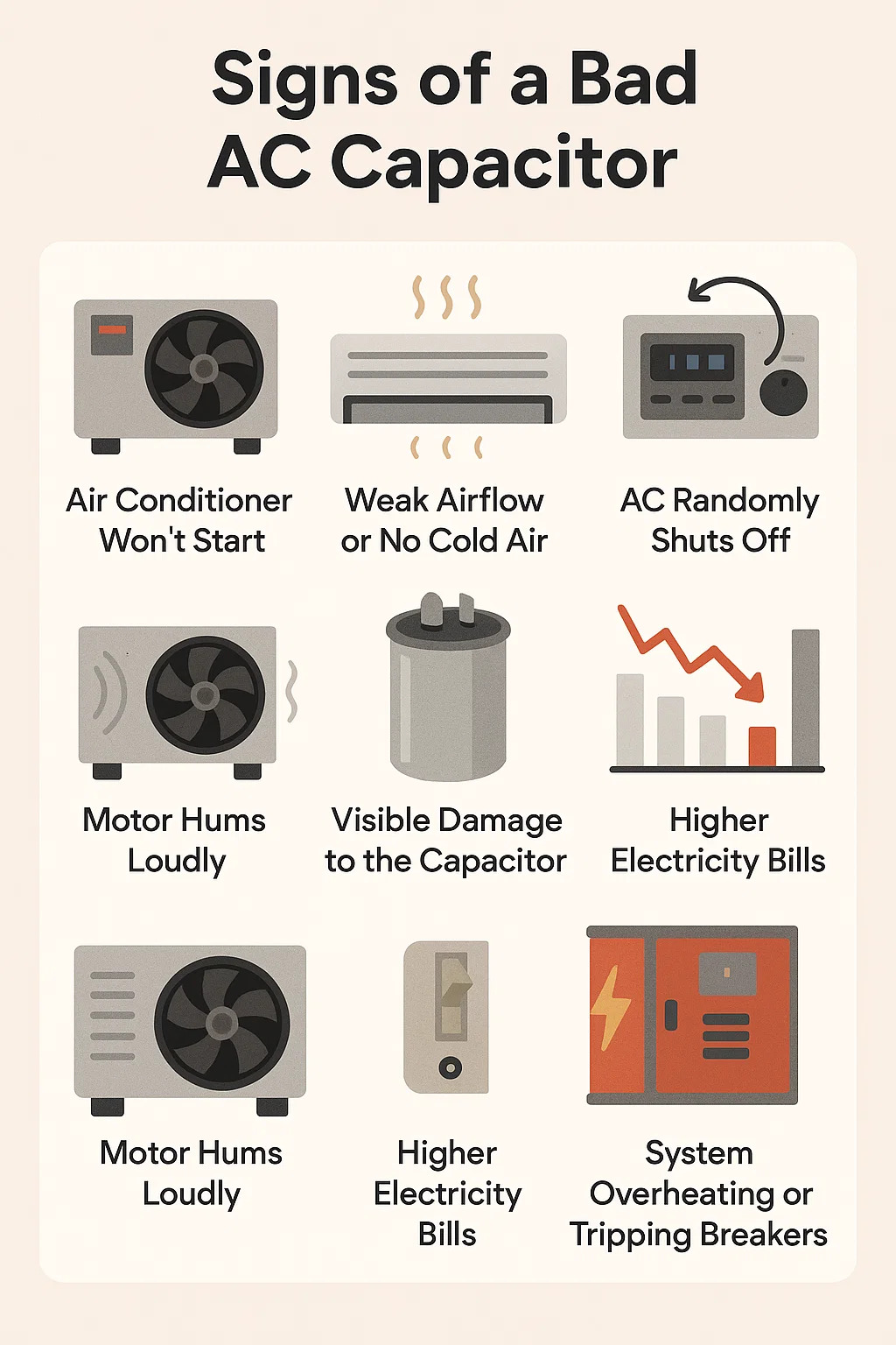 فيما يلي العلامات الشائعة التي تشير إلى أن مكثف التيار المتردد قد يكون سيئًا أو فشل: