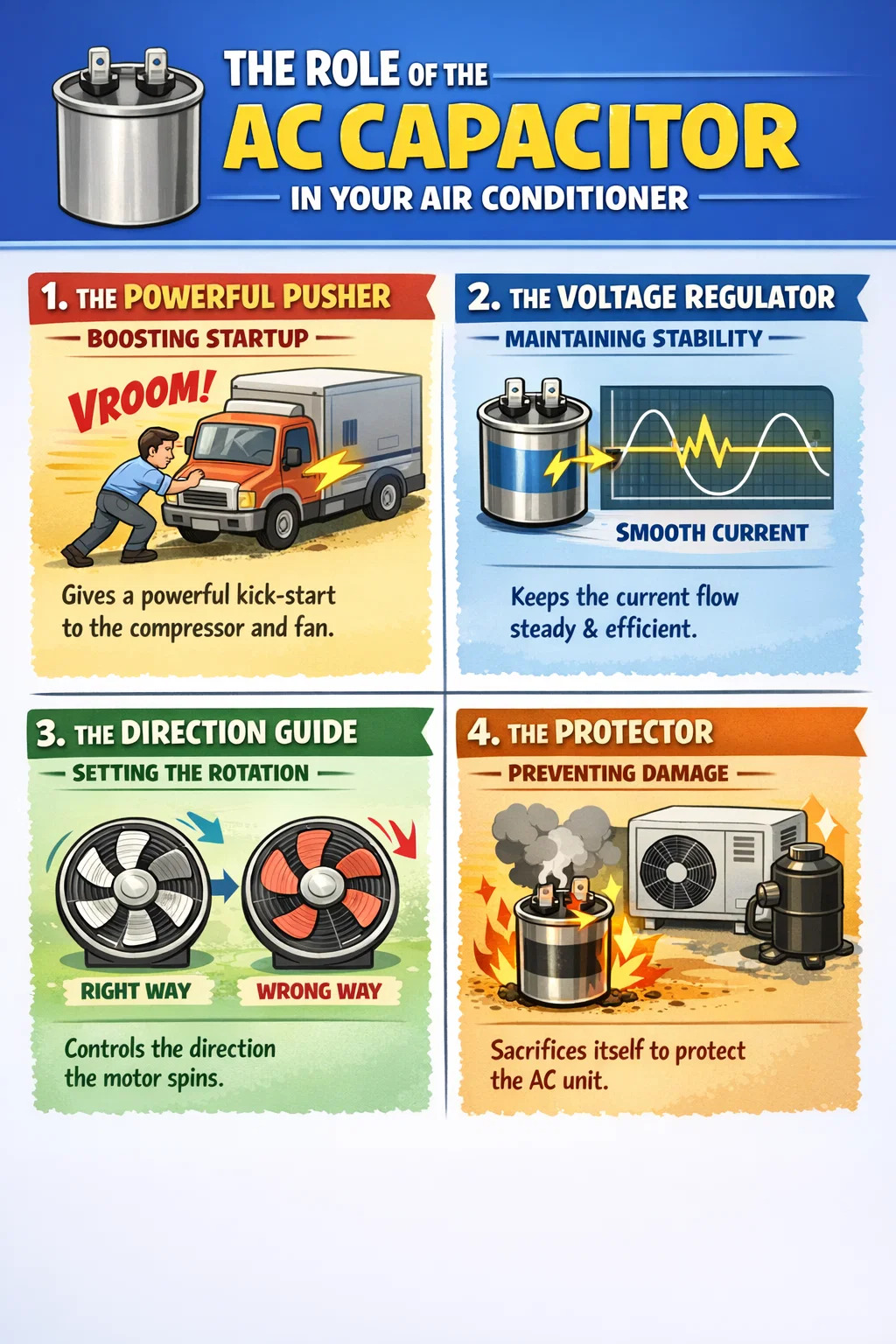 الدور التوجيهي: يقوم مكثف التيار المتردد بتوجيه اتجاه دوران المحرك عن طريق تغيير "إيقاع" التيار الذي يدخل المحرك. إذا كان المكثف معطلًا تمامًا، فقد تجد أن المروحة تدور، لكنها تدور في الاتجاه الخاطئ، أو تتأرجح في مكانها فحسب.