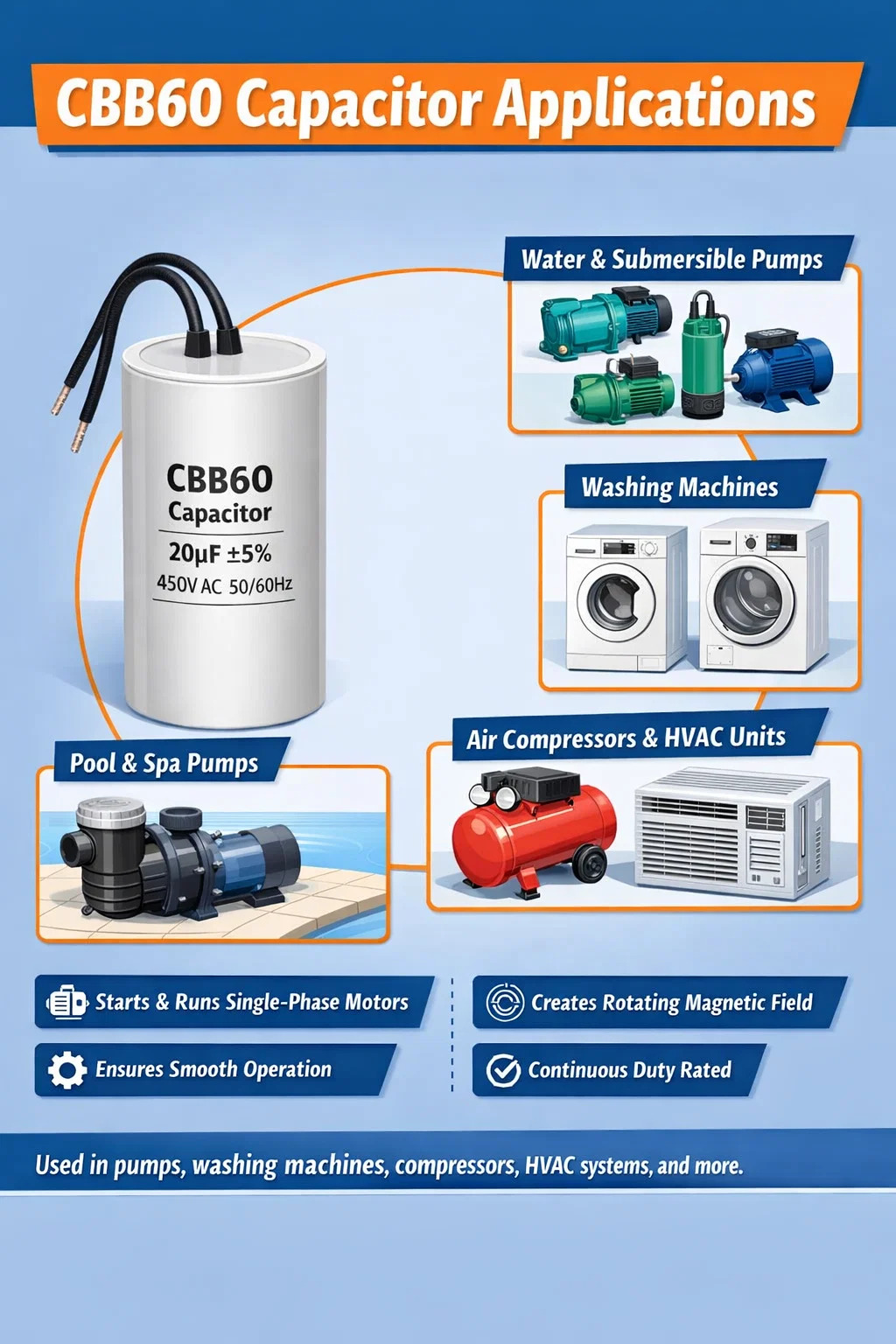 يظهر مكثف CBB60 في مجموعة واسعة من المعدات بشكل مدهش. في حين أن تطبيقات المضخات تهيمن على السوق، فإن قدرة المكون على التعامل مع جهد التيار المتردد المستمر عند التردد المقدر يجعله مناسبًا أينما يحتاج المحرك أحادي الطور إلى المساعدة في إنشاء مرحلة ثانية.