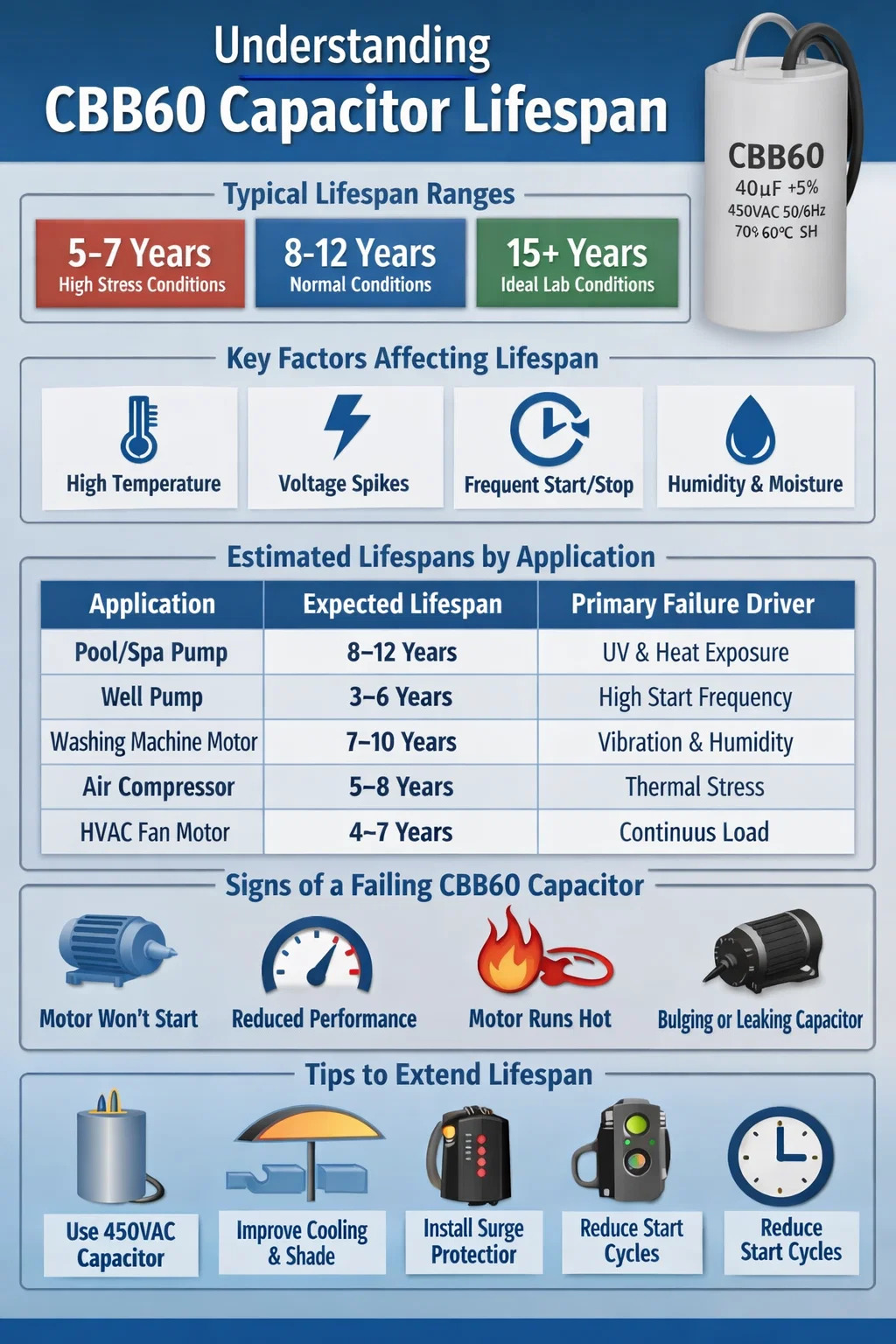 إن CBB60 عبارة عن مكثف معدني من مادة البولي بروبيلين، يستخدم على نطاق واسع في محركات التيار المتردد أحادية الطور - خاصة لمضخات المياه وضواغط الهواء والغسالات ومضخات حمامات السباحة. ويتمثل دورها في توفير التحول الطوري اللازم لبدء تشغيل المحرك بكفاءة. ولأنه يعمل بشكل مستمر تحت جهد التيار المتردد، فإن تدهوره يكون تدريجيًا ولكنه لا مفر منه.